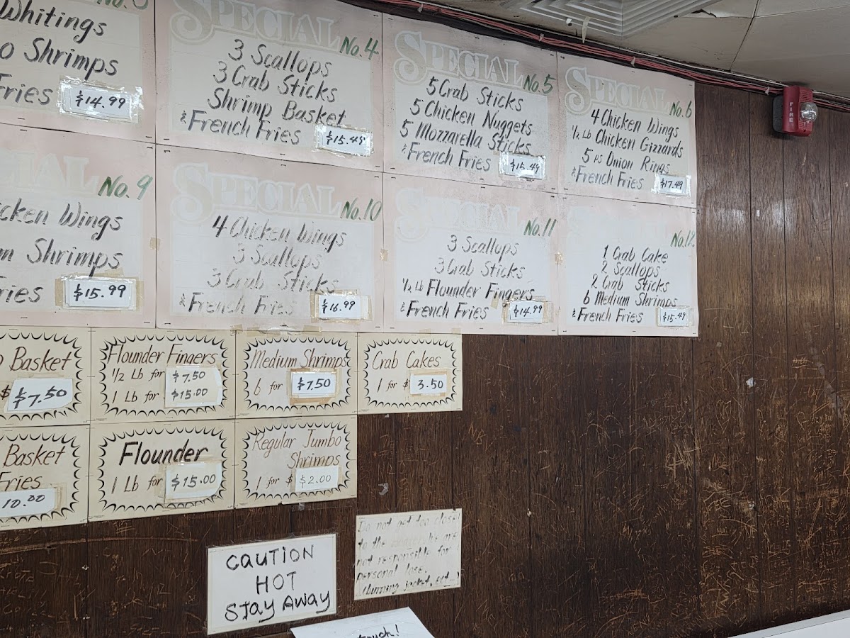 Highlighting classic items like crab cakes and jumbo shrimp, the menu balances seafood favorites with hearty sides such as fries in various sizes and styles. Alongside these, you’ll find comforting options like beef patties and trout, making it a versatile spot for different tastes.
